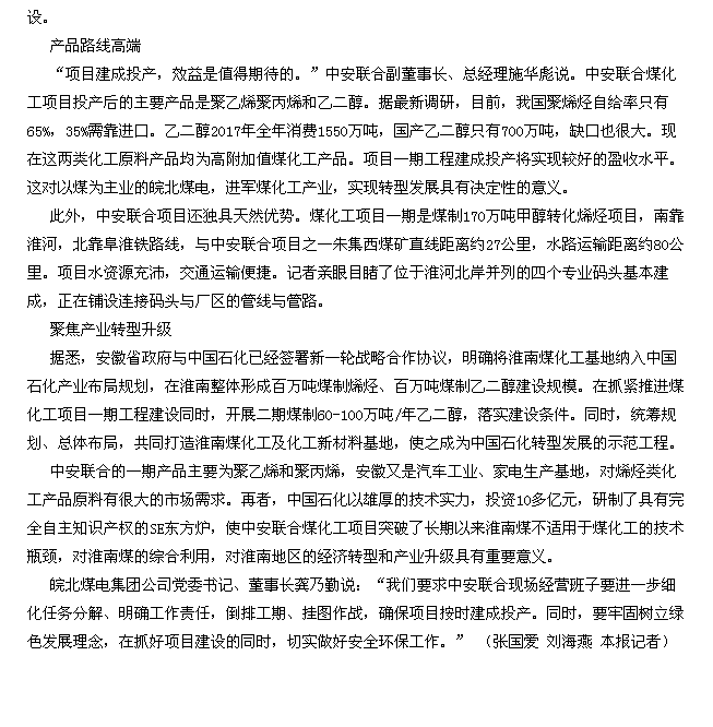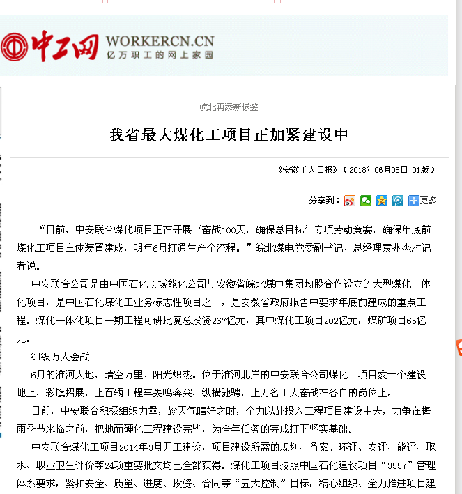 6月5日安徽工人日報(bào)頭版頭條:我省最大煤化工項(xiàng)目正加緊建設(shè)中